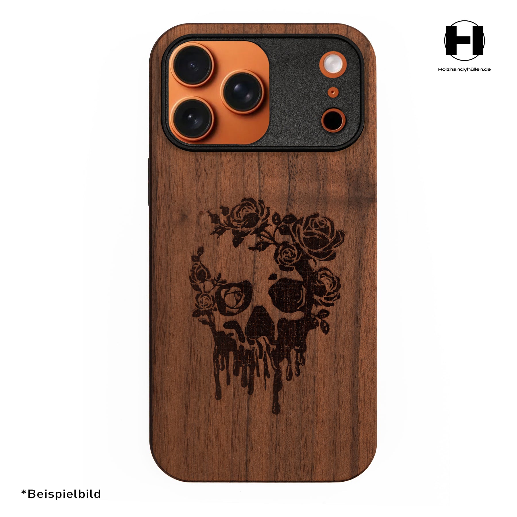 Handyhülle mit Holz und Gravur - Erleben Sie diese Handyhülle mit Echtholzanteil und mit Mag Safe bei Iphone-Modellen - einzigartig, günstig und mit gutem Schutz. Diese Handyhülle besitzt zusätzlich eine filigrane Gravur Totenkopf Rosen. Anders als alle anderen - schnell geliefert und mit bestem Kundenservice. Für ein einzigartiges, naturnahes Erlebnis!